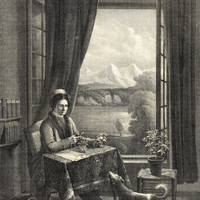 «J. J. ROUSSEAU.» (en lettres grises) «Cette vue est prise de l'intérieur de la Chambre que Rousseau occupait en 1765, à l'Ile St. Pierre, sur le Lac de Bienne, en Suisse.» (en lettres anglaises) [sic]
