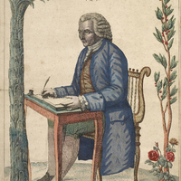 Portrait de Rousseau idéalisé, écrivain et musicien, «représenté assis sur un siège dont le dossier figure une lyre. Il est tourné de trois-quarts à gauche. Il porte l'habit du Rousseau herborisant; il est tête nue. Il est installé devant une petite table sur laquelle repose un encrier et une liasse de feuilles. Il est occupé à écrire avec une plume d'oie.