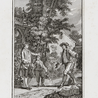 «un jardin potager. A [droite], on voit un jardinier, de profil à [gauche], son chapeau sur la tête et tenant sa bêche. A [gauche], J.J. Rousseau, de profil à [droite], tient Emile par la main. Celui-ci tient un arrosoir de sa main [gauche].» (G2: p. 35-36, 2e planche)