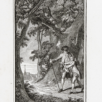 «Au milieu d'un paysage boisé, J.-J. Rousseau et Emile, à [droite], se dirigent vers la [gauche]. Au fond, à [gauche], le clocher de Montmorency s'élève au milieu du village.» [scène «le Méridien» où Emile découvre l'orientation] (G2 : p. 36-37, 4e planche)