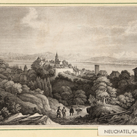 - Vue de la colline du château et de la Collégiale de Neuchâtel du vallon du Seyon.