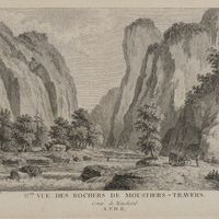 «II.ME VUE DES ROCHERS DE MOUSTIERS-TRAVERS. / Comté de Neuchatel.» Tableaux de la Suisse N°96. [bas]
