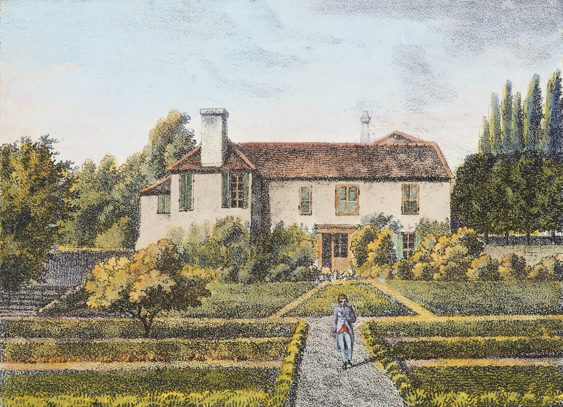 La maison des Charmettes, presque de face, entourées d'arbres. sous un ciel nuageux. Au centre, au premier plan,un soupirail. Sur le sentier, à droite, un homme qui se promène dont le chapeau en haut-de-forme de la gravure de Hamilton / Guyot (voir 92.5.52) est remplacé par un chapeau rond.
