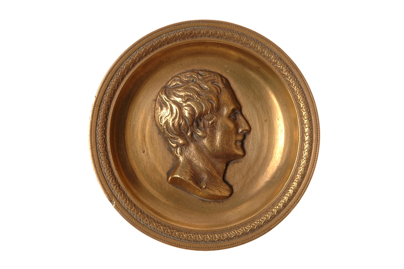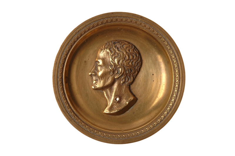 Applique de décoration en laiton pour un meuble de style, de forme ronde, bordure décorée d'une couronne (entrelas); au fond de la cuvette, buste de Rousseau, de profil à droite, nu tête, coiffure à la romaine, maintenu au fond de la cuvette par un rivet.