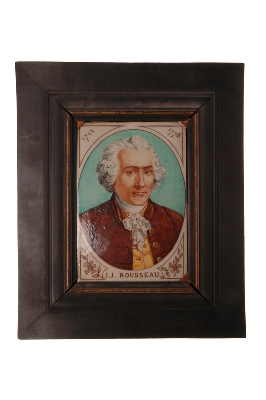Portrait peint sur faïence entouré d'un large cadre en bois noir. Rousseau est représenté de trois-quarts à droite, arborant un habit à la française à 3 boutons de couleur brune, un gilet jaune, un jabot de dentelle, et portant perruque.