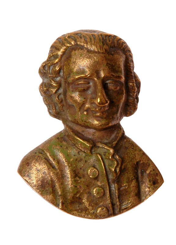 Applique (pas-de-vis au dos) en bronze, représentant Rousseau en buste à hauteur de poitrine, presque de face, tourné légèrement à droite, en habit français à trois boutons, tête nue et perruque.