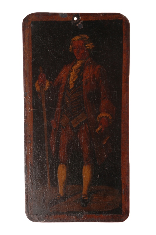 Plaque de tôle peinte à l'huile représentant. dans un cadre peint, Rousseau en pied, tête nue, en perruque, tenant sa canne de la main droite, une liasse de papiers de la main gauche et son chapeau sous le bras gauche. Sa redingote est largement ouverte et dégage le gilet et le long jabot de dentelle. De la dentelle apparaît aux deux poignets. Son habit est de couleur brune, les bas blancs et il porte des souliers à boucle. Le fond est noir, sauf le sol sur lequel il se tient. Un trou permet de suspendre la plaque.