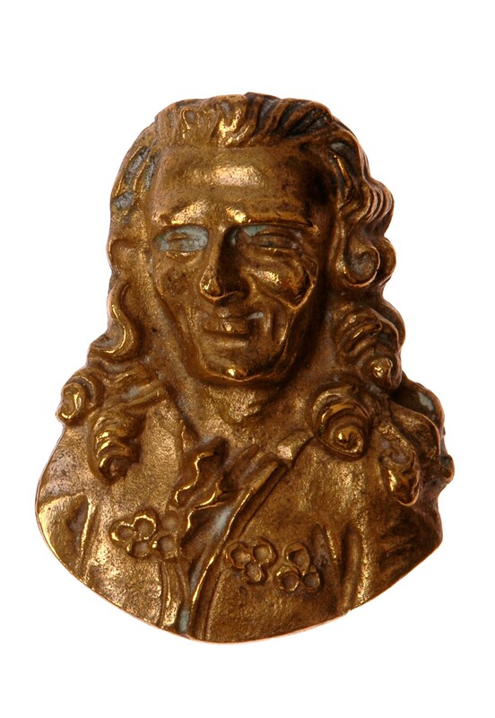 Applique (pas-de-vis au dos) en bronze, représentant Voltaire en buste à hauteur de poitrine, tourné très légèrement à gauche, en habit à brandebourgs, tête nue, perruque tombant sur les épaules.