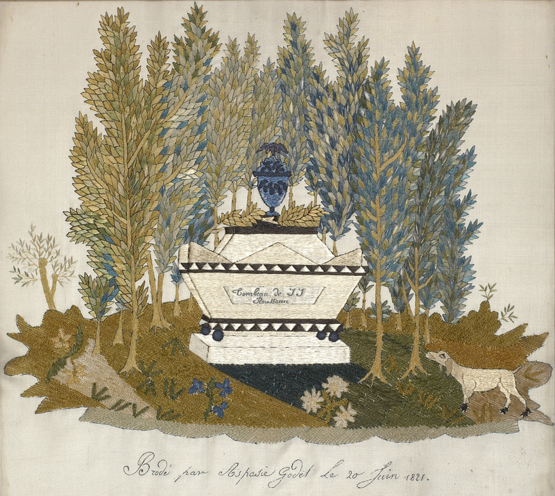 Broderie à claire-voie représentant de manière fantaisiste le tombeau de Rousseau sur l'Ile des Peupliers à Ermenonville; au premier plan, quelques plantes fleuries, à droite un mouton. Sur le monument, des branches et une urne.