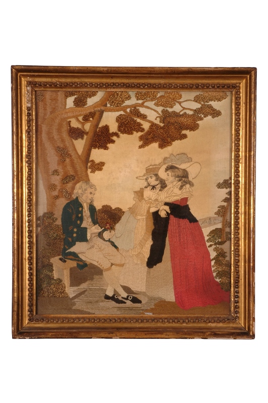 Technique: les visages et les mains ont été dessinés, le tronc du grand arbre, le banc de pierre, le sol, les vêtements sont faits de fil de soie. Ces pièces sont brodées sur un tissu, les feuillages sont en chenille.