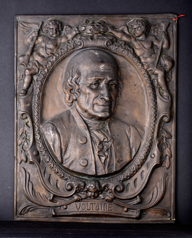 Plaque de bronze patiné à suspendre, au centre de laquelle se trouve le buste de Voltaire, profil à droite, tête nue, en perruque. La plaque et le bas-relief forment un tout.