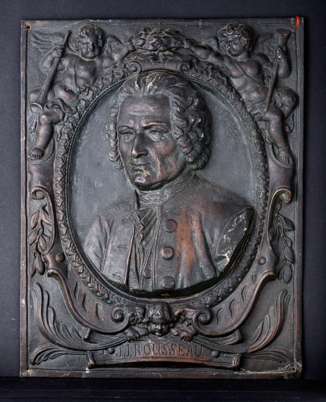 Plaque de cuivre repoussé. Rousseau est en buste à mi-corps, tourné de ' à gauche, tête nue, perruque, dans un ovale orné, entouré d'amours tenant une couronne au-dessus de sa tête. Au-dessous de l'ovale, une tête d'amour ailé et un cartouche.