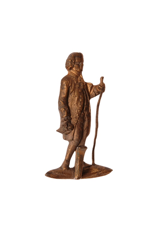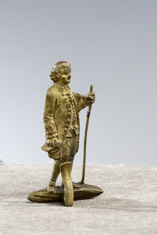 Porte-montre à gousset. Jean-Jacques Rousseau en pied, debout, de ' à droite, tenant sa canne de la main gauche et son chapeau sous le bras gauche; la main droite porte une liasse de papiers et des papiers débordent de la poche de droite (d'après le Rousseau du sculpteur Suzanne «dans l'attitude de marcher»). Le crochet pour suspendre la montre est fixé sur le sol.
